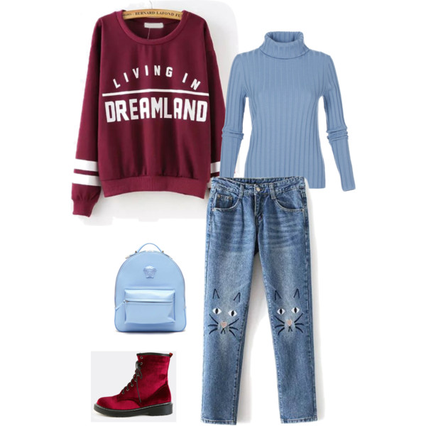 Джинсы «бойфренды» и голубая водолазка отлично подойдут к спортивному джемперу цвета марсала в стиле оверсайз. Добавьте ботинки на низком ходу красного цвета и голубой кожаный рюкзак – и удобный комплект готов.